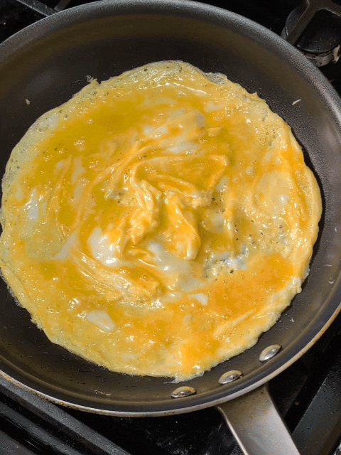 After the eggs are formed into a folded package, add any additional cheese slices on top, and add the already cooked bacon to the pan. Turn the stove heat off and let everything sit in the pan, warming while you prepare the roll.